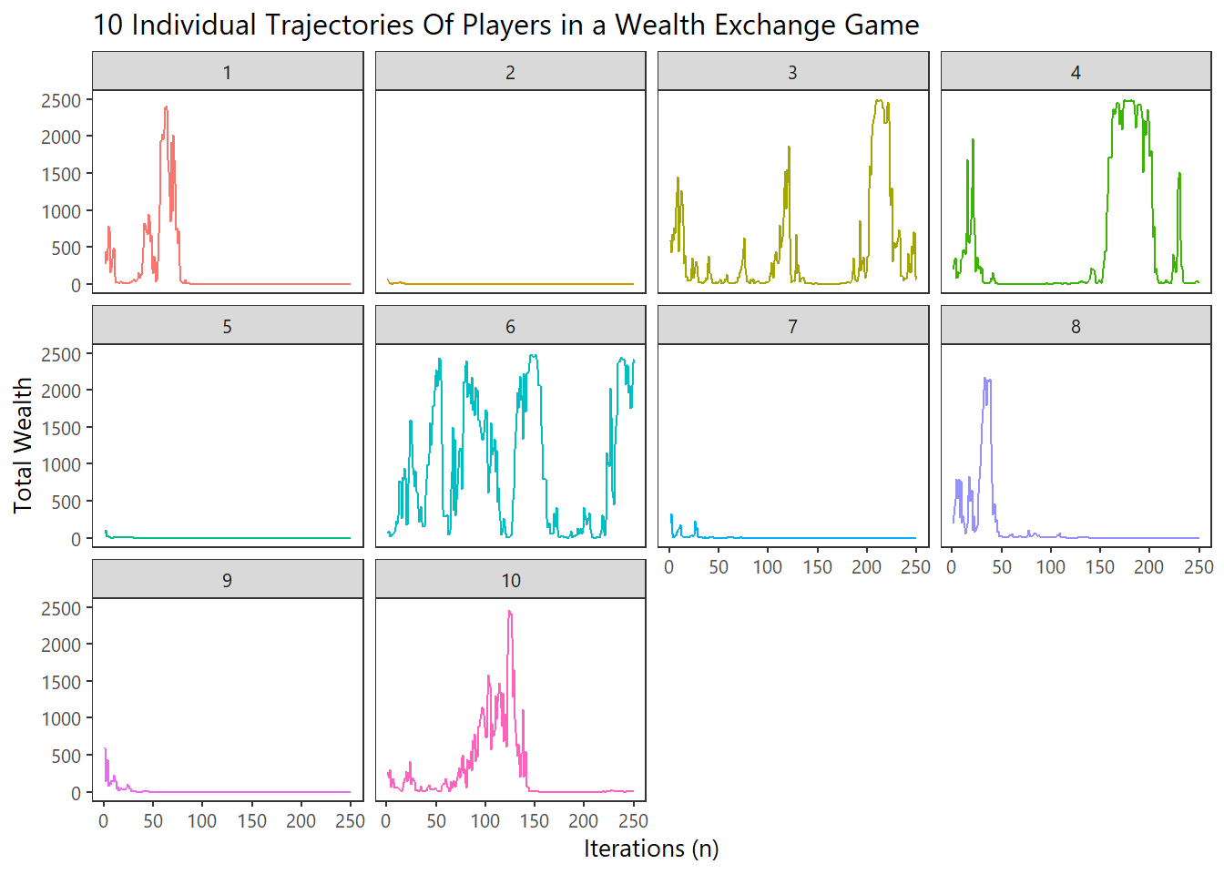 labs(title="10 Individual Trajectories Of Players in a Wealth Exchange Game") +