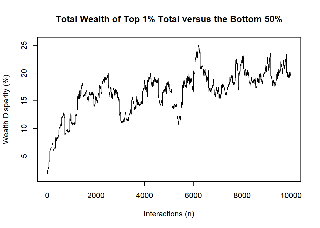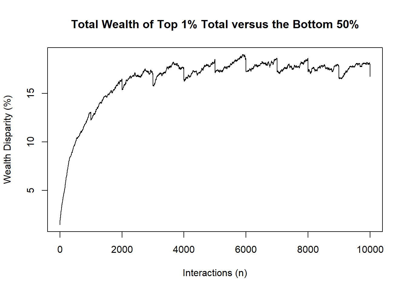 Within the loop itself the transactions are recorded, and a diagnostic measure of wealth inequality comparing the “Top 1% of earners” and the “Bottom 50%” is computed and returned as the default object of the function