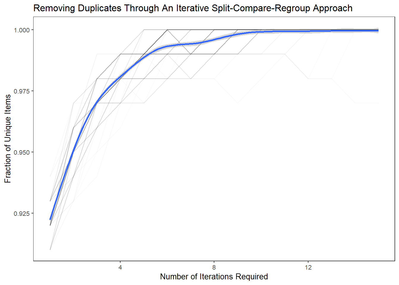 labs(title="Removing Duplicates Through An Iterative Split-Compare-Regroup Approach") +