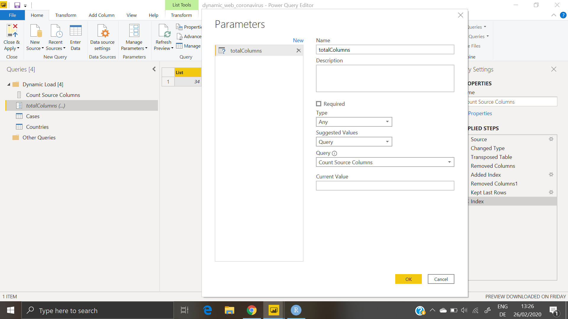 A new parameter TotalColumns is fed the values from the above query, with no default given.