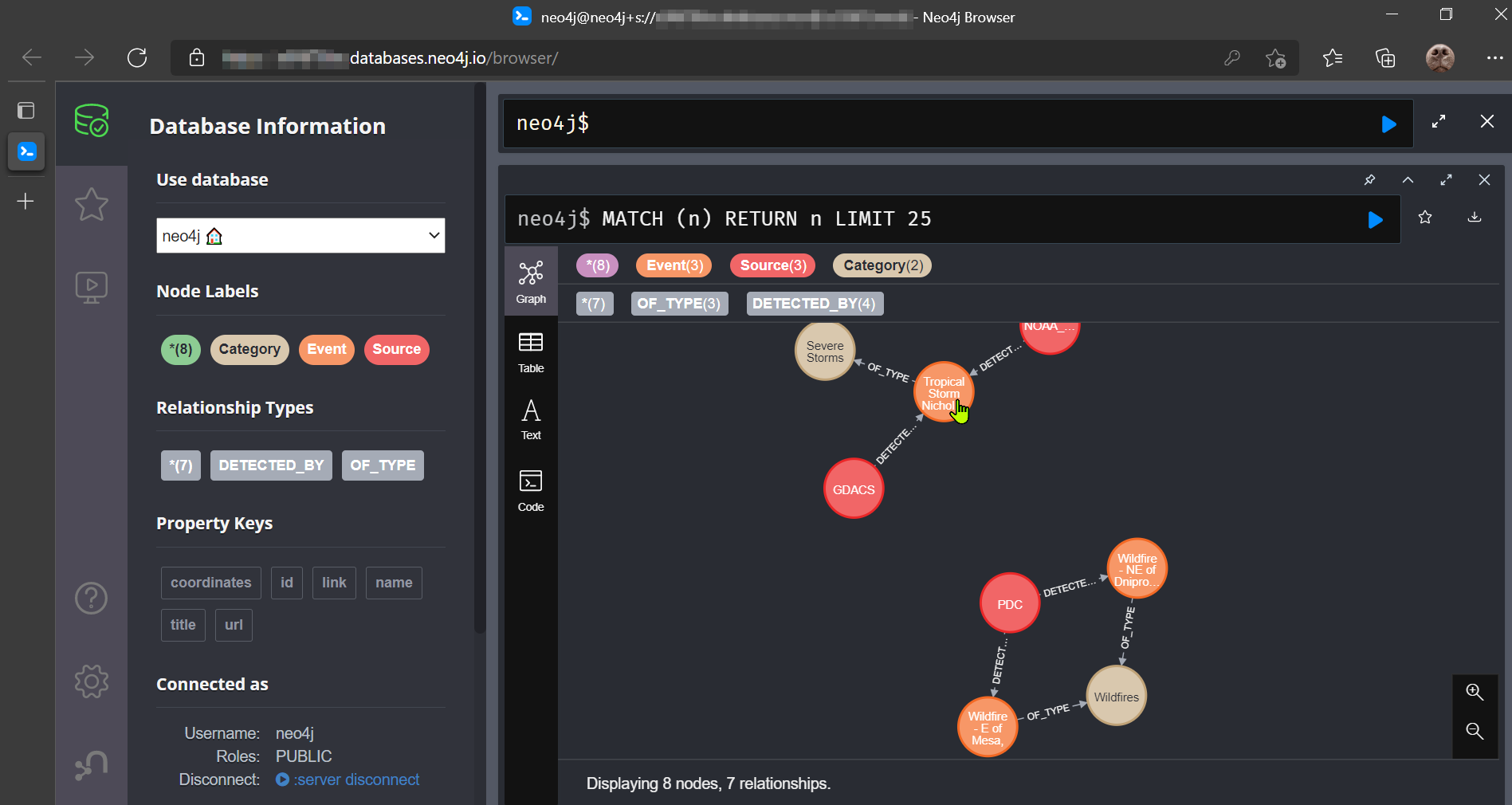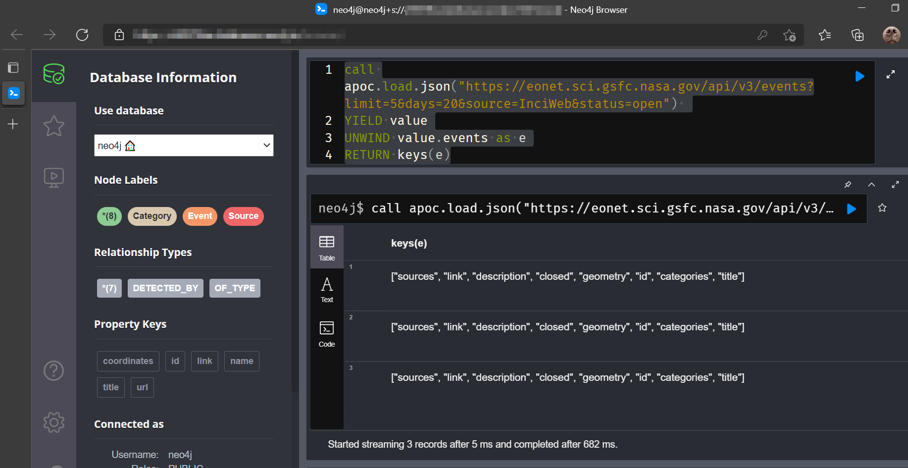 This post is heavily inspired by that of William Lyon, check-out his original post for more details on the setup and work-flow. Here I use the publicly available API of the Nasa Earth Observatory Natural Event Tracker to periodically query the endpoint for newly registered storm, wildfire, earthquake, and flood events. In the same call I also compile their associated source and meta-data into a simple graph-model.