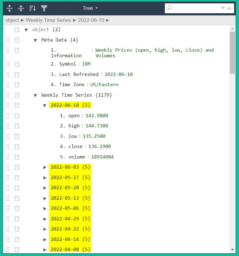 Queryiny the TIME-SERIES API returns a nested JSON structure, with the top-level object, holding a further top objects, “Meta”, “Weekly Time Series”. Within the “Weekly Time Series” object a further object nesting is present, holding the weekly prices where each week-object is tagged with its date.